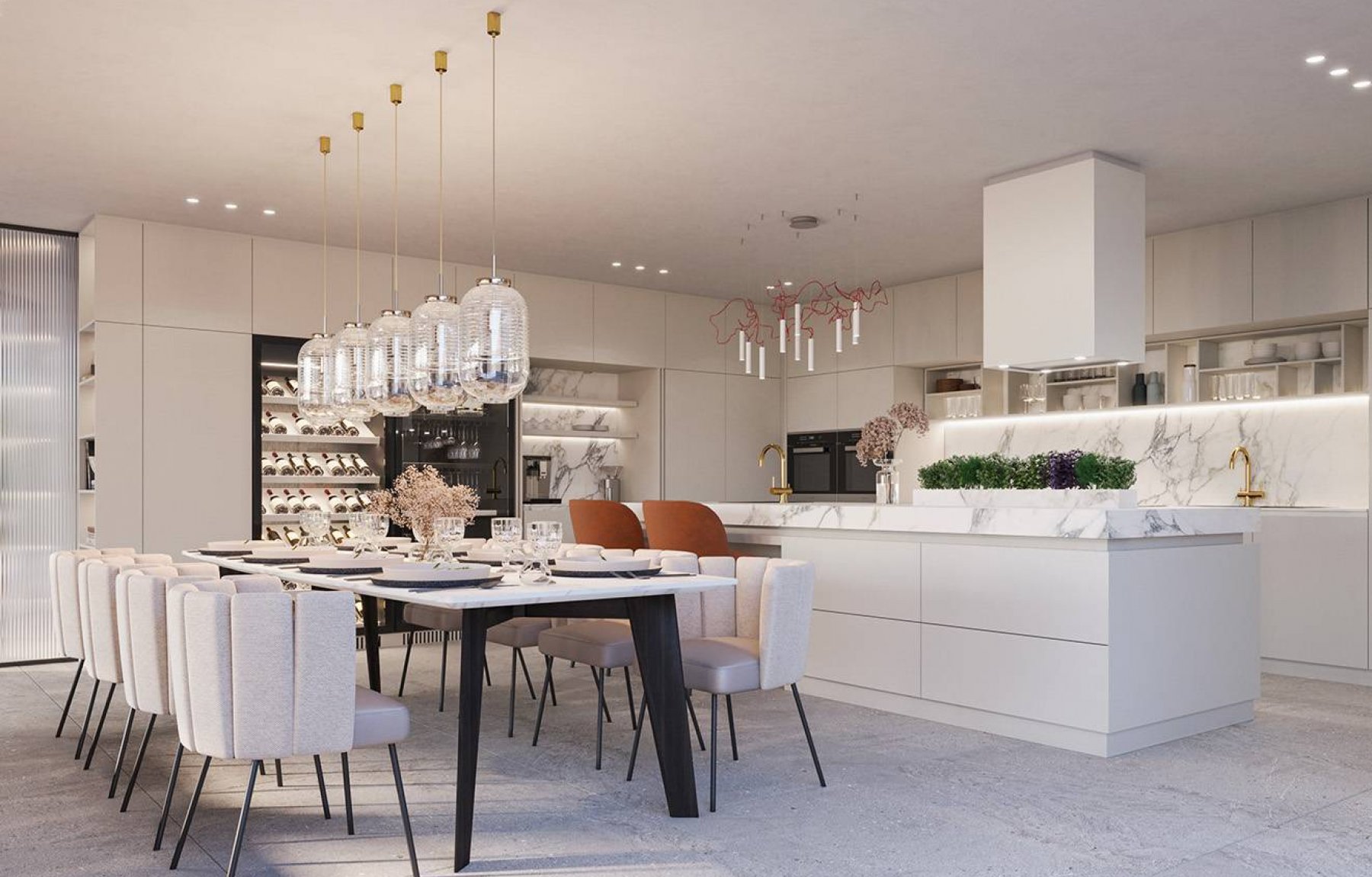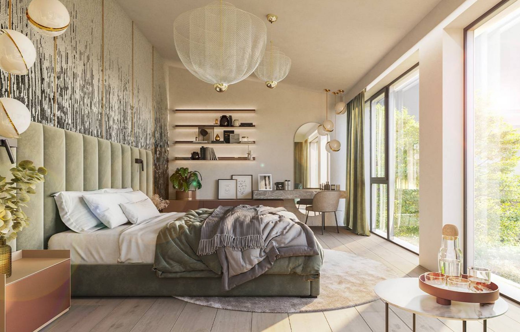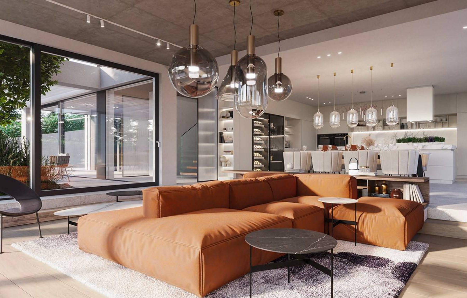 Díky velkoformátovým oknům jsou všechny ložnice plné denního světla a nabízí uklidňující pohled do zelené zahrady, na řeku a do širokého okolí. Schodištěm se dostaneme do primárně společenského přízemí vily. Této části domu vévodí nadstandardně velký obývací pokoj o velikosti 87 m2. Ozdobou tohoto prostoru je otevřená kuchyně s moderním kuchyňským ostrůvkem s barovým posezením, na který navazuje jídelní část, která počítá s velkým stolem a pohodlným posezením. I spodní části dominují velkoformátová okna, která důmyslně propojují interiér s exteriérem. Vzdušnost a propojenost obývacího pokoje s okolní zahradou podtrhují dvě přiléhající terasy. Na hlavní terase je počítáno s umístěním venkovního jídelního stolu a grilu.