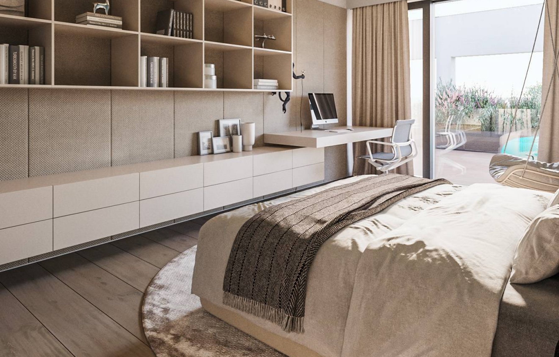 Na terasu lze vstoupit i z luxusního wellness, kde je počítáno s umístěním vířivky, sauny a sprchového koutu. Chvíle odpočinku si můžete s rodinou či přáteli užít v přiléhajícím venkovním bazénu, jehož vyhřívání zajišťuje vlastní tepelné čerpadlo. Spodní patro dále nabízí praktickou spíž, sklad a toaletu. Součástí patra je praktická místnost se vstupem ze zahrady, která může posloužit například pro uložení zahradního náčiní a nábytku. Pro snadnou údržbu zahrady je počítáno s umístěním zavlažovacího systému s napojením na retenční nádrž. Druhé patro domu je vyhrazeno čistě pro soukromí obyvatel. Nachází se zde hlavní ložnice a další tři pokoje. Hlavní ložnice má téměř 30 m2, náleží k ní stylová průchozí šatna o velikosti 17 m2 a vlastní prostorná koupelna s vanou, sprchovým koutem, moderním dvojumyvadlem a oddělenou toaletou s bidetem. Koupelnou a šatnou disponuje i další ložnice s výměrou 23 m2. Zbylé dva pokoje o velikosti 18 m2 mají na sebe navazující walk-in šatny, ke kterým náleží společná koupelna s vanou, sprchovým koutem a samostatnou toaletou.