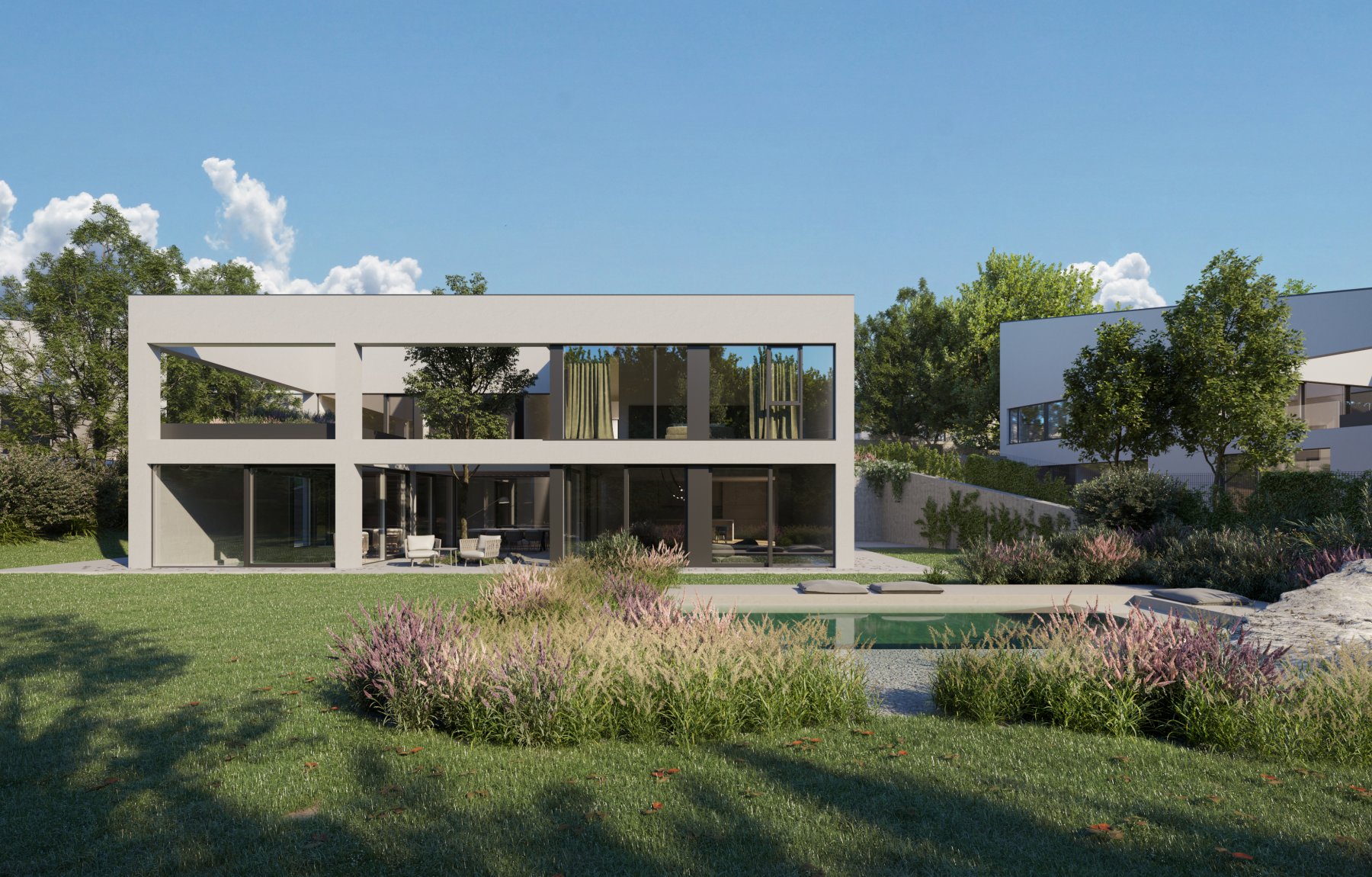Velkorysá vila s moderními čistými liniemi a vysokou kvalitou zpracování snadno nadchne každého milovníka otevřených prostor a propojení interiéru s exteriérem. Promyšlenou orientací a zasazením domu bylo dosaženo optimálního využití parcely, poskytující dokonalé výhledy do údolí řeky Vltavy. Dvoupatrová stavba nadčasové vily reflektuje současné vysoké nároky na bydlení, ať už jde o provedení, velikost obytné plochy, architekturu, moderní design nebo dostatečnou dávku soukromí od sousedních parcel. Pocit soukromí podtrhuje orientace většiny prosklených ploch, a to směrem do údolí, interiér domu je tak skryt nežádoucím pohledům z příjezdové cesty.