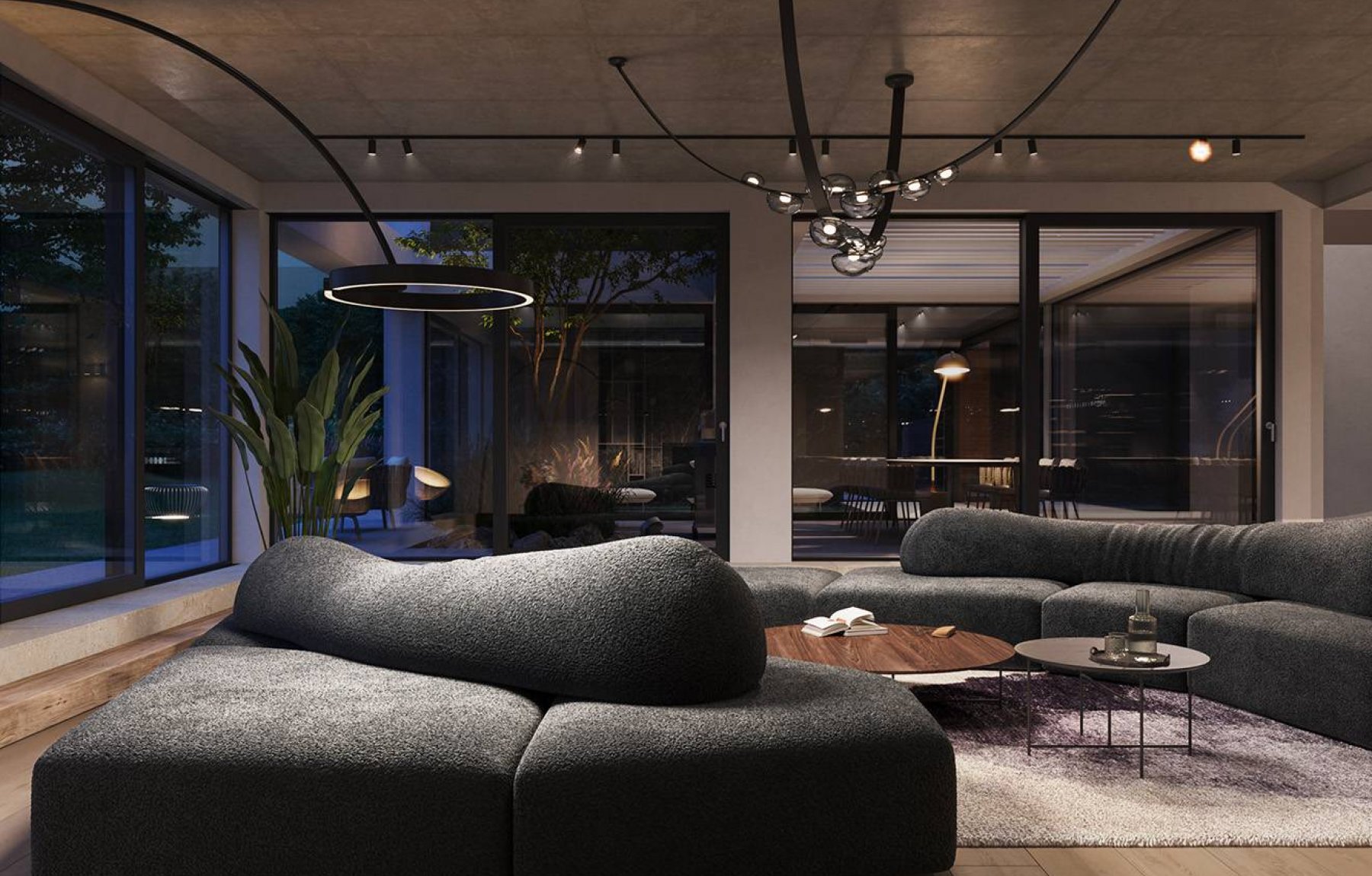 Vila je, pro zajištění naprostého komfortu obyvatel, strategickým rozmístěním pokojů rozdělena na společenskou a privátní zónu. Celková užitná plocha nově vznikající stavby činí nadstandardních 508 m2. Společenskou část domu tvoří přízemní patro, jehož centrální částí je prostorný obývací pokoj s navazující otevřenou kuchyní a jídelnou s plochou více jak 100 m2. Výrazným prvkem přízemí je i otevřené atrium se zelení a venkovním posezením pro příjemně strávené dny s rodinou či přáteli. Zastřešené atrium zároveň slouží jako spojovací prvek mezi zahradou a privátním wellness s vnitřním nerezovým bazénem a saunou. Součástí patra, které krom atria obklopují další tři terasy, je i pracovna, pokoj pro hosty s vlastní koupelnou, velkorysé technické zázemí včetně prádelny a spíže, toaleta, prostorná chodba a další praktická místnost se vstupem z terasy, která je vhodná například pro uložení zahradního náčiní a nábytku.